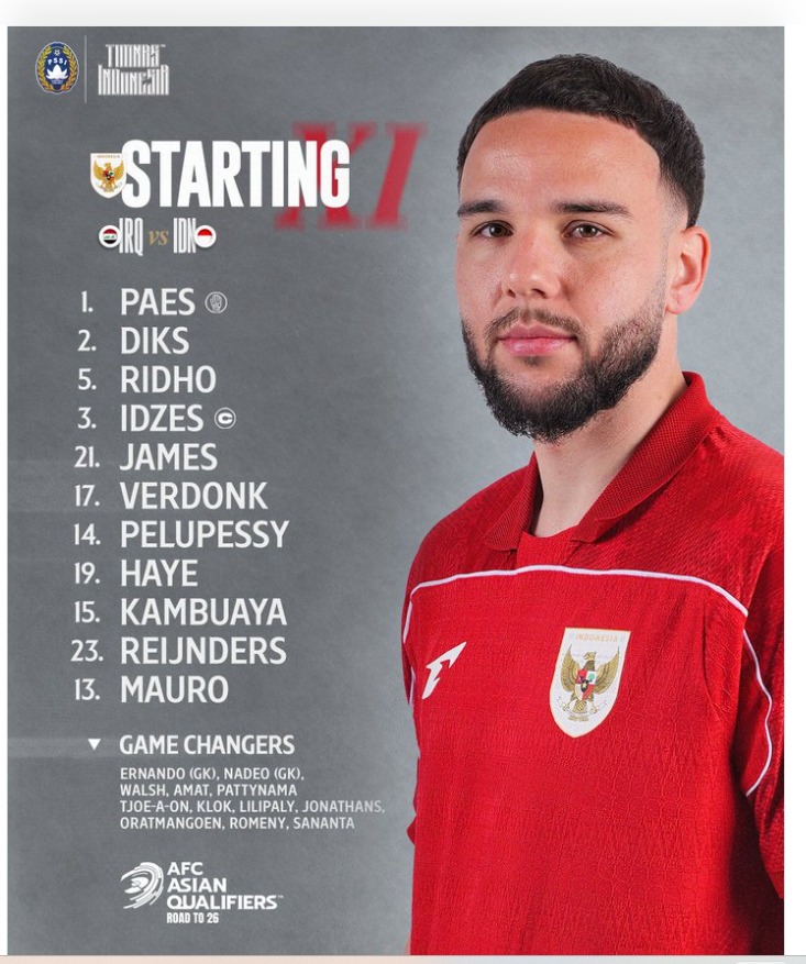 Lawan Irak, Kluivert mengawali pertandingan penentuan dengan lima perubahan drastis dibandingkan lawan Saudi. Rizky Ridho, Calvin Verdonk, Thom Haye, Eliano Reijnders dan Mauro Zijlstra jadi pemain mula.