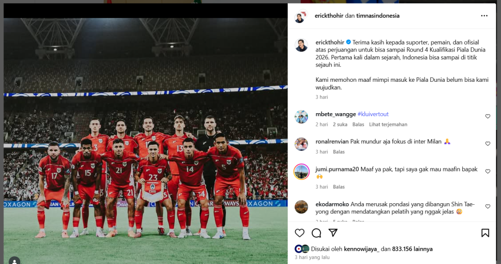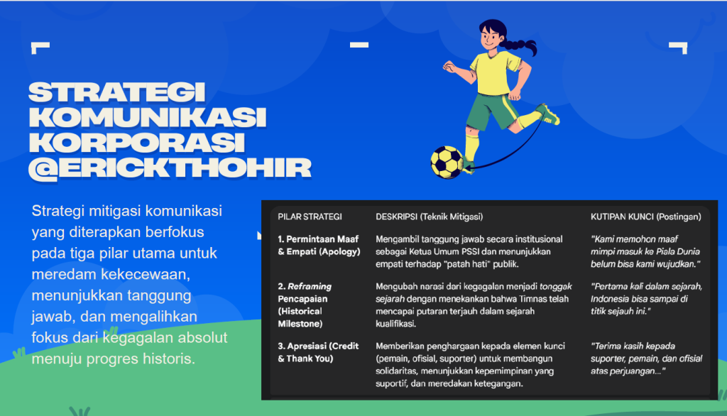 Analisis mahasiswa-mahasiswi ini menarik. Memberi apresiasi pada postingan @erickthohir yang sekaligus menyatakan: permintaan maaf dan empati (apology), reframing pencapaian (historical milestone) dan apresiasi (credit and thankyou).