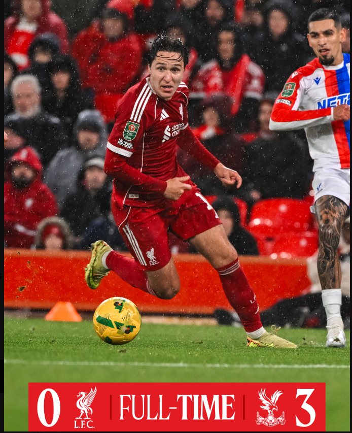 Postcription: Crystal Palace menang 3-0 di Anfield dan menghancurkan harapan Liverpool kembali ke final Piala Liga. Ismaila Sarr kembali jadi hantu dengan mencetak dua gol ke gawang The Reds.