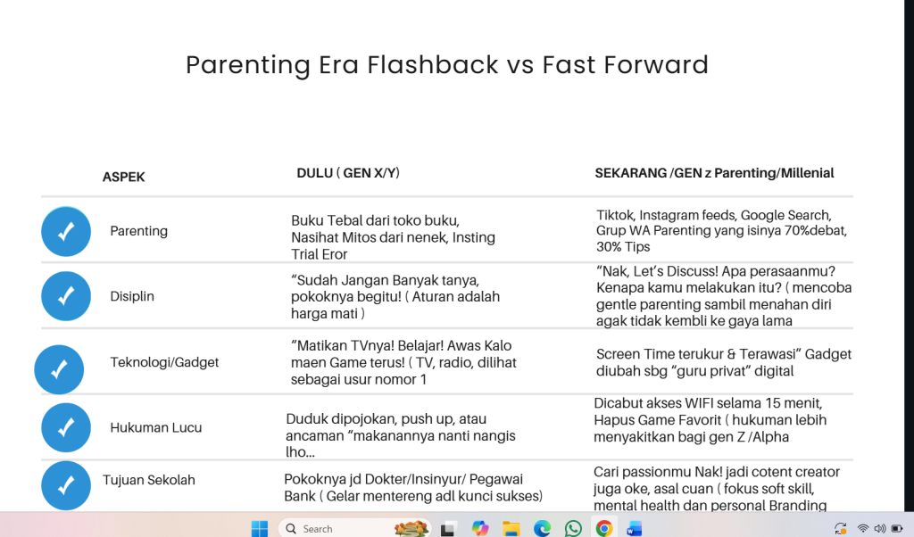 Misalnya, sumber ajaran parenting belasan tahun lalu bersumber dari buku tebal dari toko buku, nasihat mitor dari nenek, dan juga insting ‚trial and error‘. Sementara era saat ini, patronnya dari Instagram, Google Search, atau bahkan dari Grup WA Parenting yang kerap isinya lebih banyak depat daripada tips.