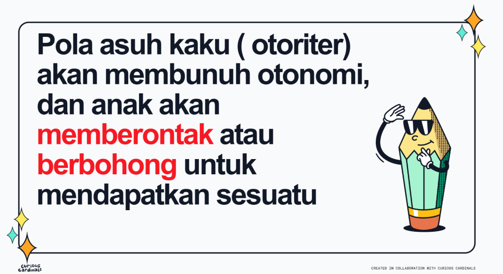 “Pola asuh kaku (otoriter) akan membunuh otonomi dan anak akan memberontak atau berbohong untuk mendapatkan sesuatu,“ tukasnya.