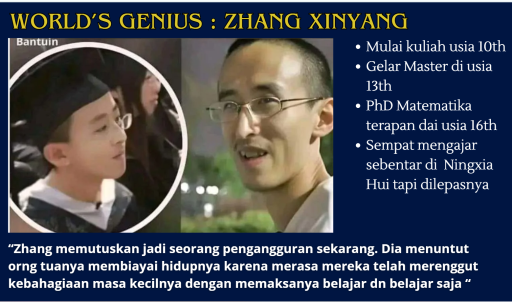 Sebuah kisah menarik disampaikannya dari hidup Zhang Xinyang adalah seorang pria asal Tiongkok yang terkenal sebagai ‚anak jenius‘ karena berhasil masuk universitas pada usia 10 tahun dan meraih gelar doktor pada usia 16 tahun. Namun, kini pada usia 28-30 tahun, ia dikenal sebagai pengangguran yang hidup bergantung pada orang tuanya.