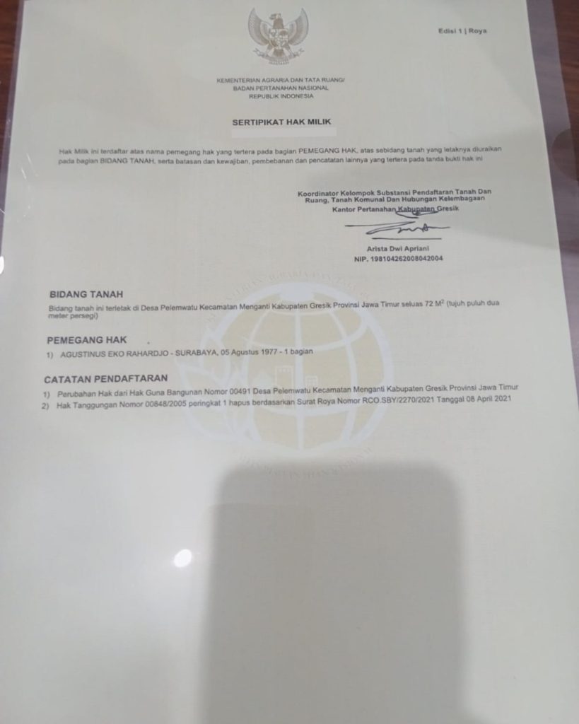 Rumah di Menganti, Gresik, cukup lama tak terurus administrasinya. Lunas lewat kredit 15 tahun sejak 2004, sertifikat akte tanah asli dikirim dari Bank Mandiri Surabaya untuk diambil di Bank Mandiri BSD Tangerang Selatan beberapa tahun lalu.