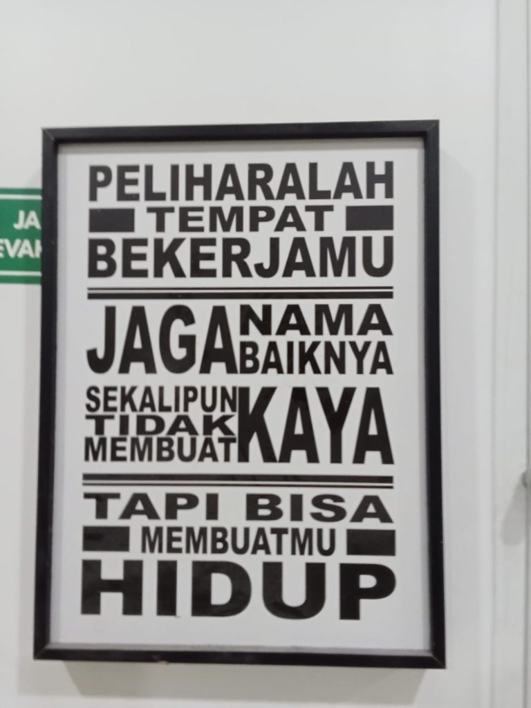 Selain itu, ada pula hiasan bertuliskan, ”Pelihara tempat bekerjamu. Jaga nama baiknya. Sekalipun tidak membuat kaya, tapi bisa membuatmu hidup.”