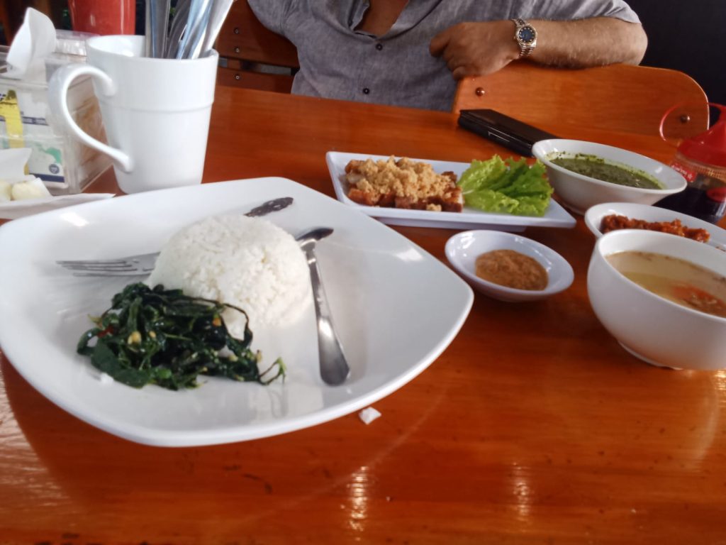 Seperti hari itu, aneka mobil terparkir rapi. Pengunjung resto menikmati berbagai menu. Bunga Pepaya Teri, Steak Ribs dan Fried Pork serta banyak pilihan sayur.