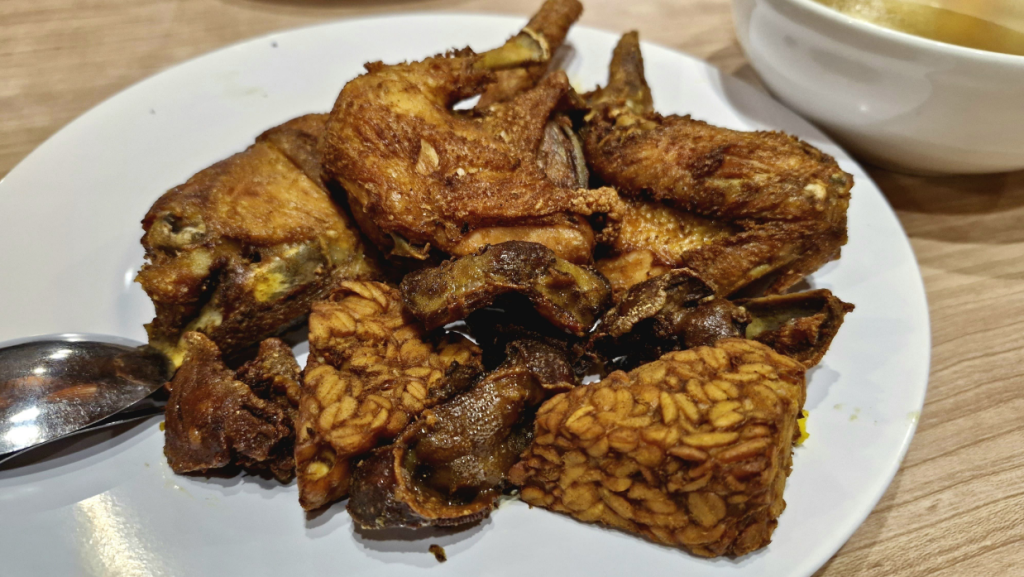 Maka, usai Misa Natal, kami mencoba Resto Tojoyo 3 Jalan Godean kilometer 5. Baru dibuka pertengahan 2025, menyusul rumah makan Tojoyo sebelumnya di Ngupasan dan Heha Sky View. Di Tojoyo Godean, lokasinya berdampingan dengan counter aksesoris ponsel yang menobatkan diri sebagai ’pusat casing hape terbesar se-Indonesia’.