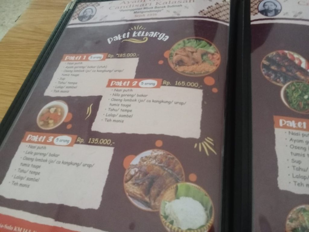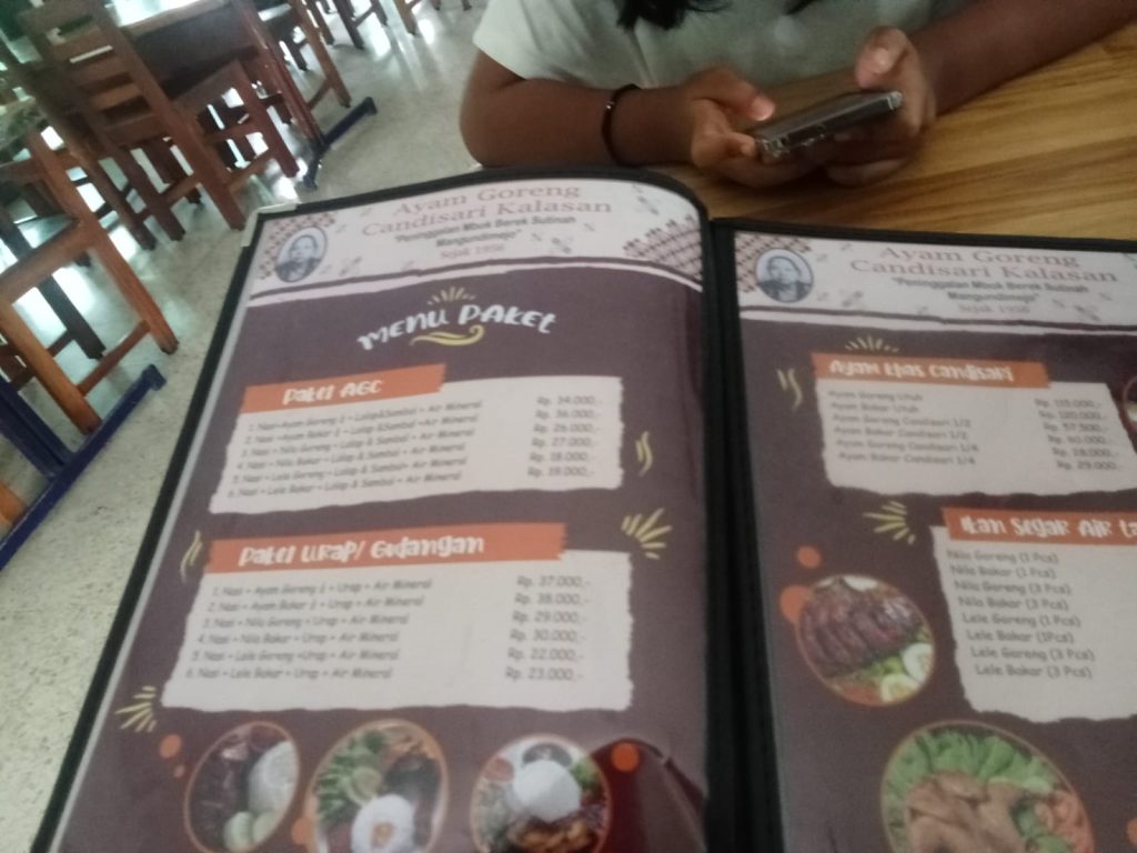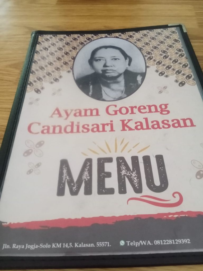 Setelah random melewati berbagai opsi, akhirnya kami berhenti di Ayam Goreng Candisari Kalasan. Bangunan luas, sepertinya rumah warisan. Menunya, tak hanya ayam yang bumbunya meresap sampai tulang. Ada pula ikan nila, udang, pun lobster.