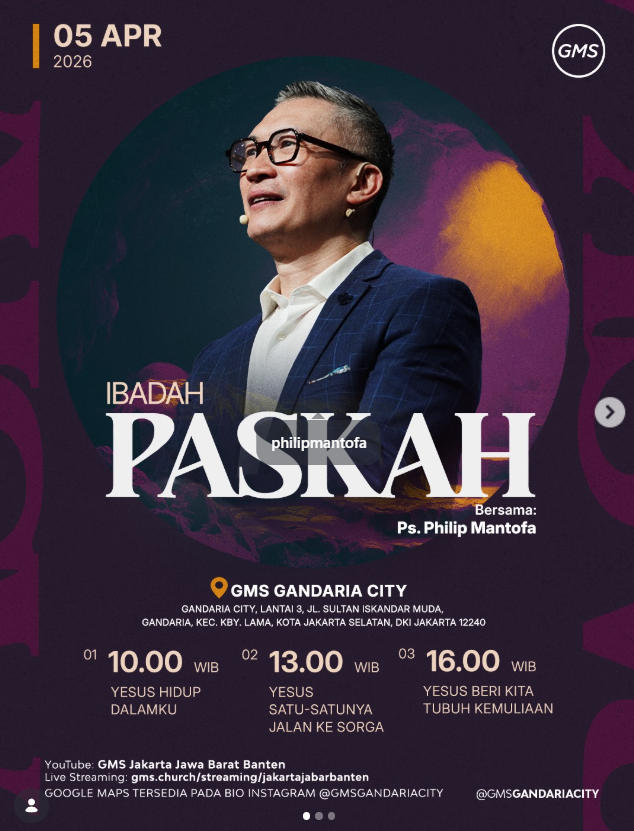 Pada Paskah ini, Pastor Philip Mantofa melayani tiga ibadah di GMS Gandaria City. Ini resume ibadah ketiga, pukul 16.00 WIB.