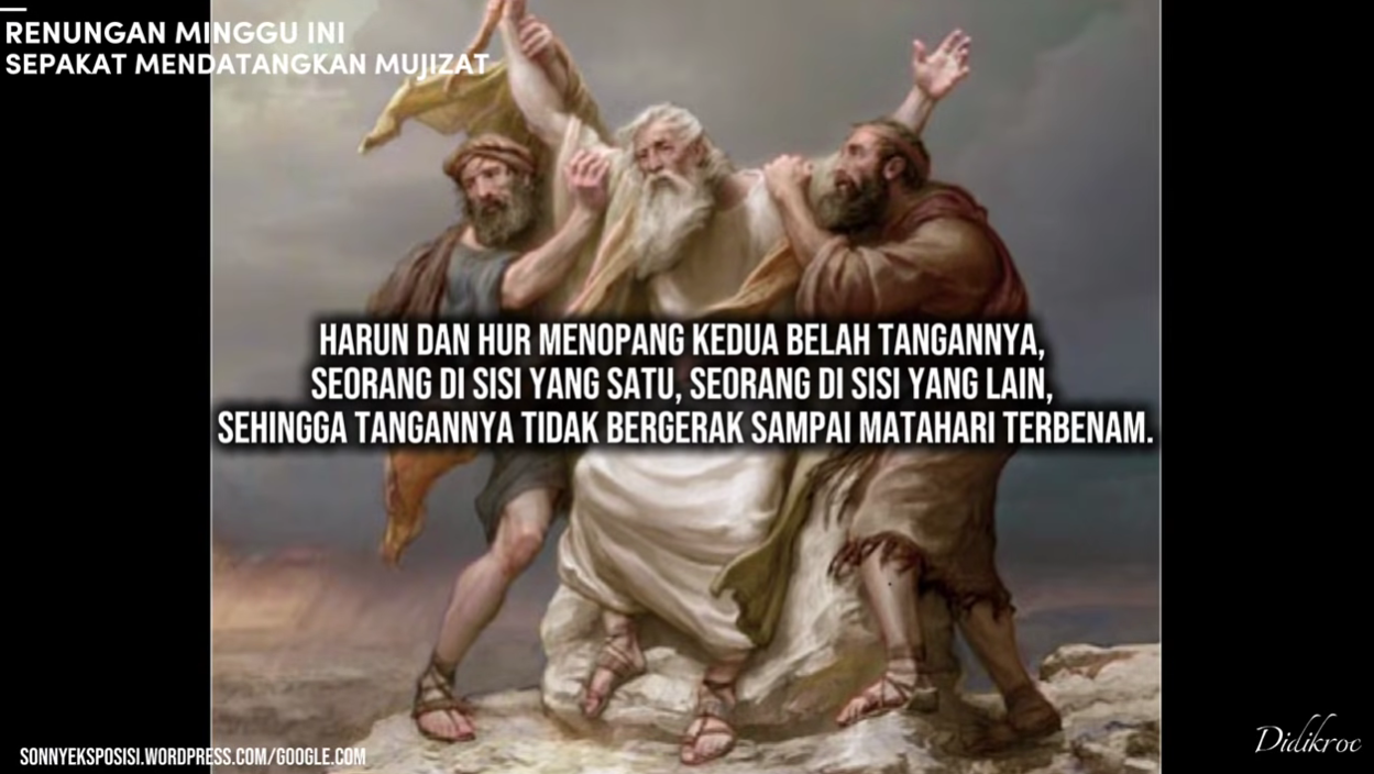 Kemenangan tidak terjadi secara kebetulan, tapi dengan sinergi doa dan kesepakatan rohani. Peperangan tak hanya terjadi secara fisik, tapi juga oleh doa Musa di atas bukit.
