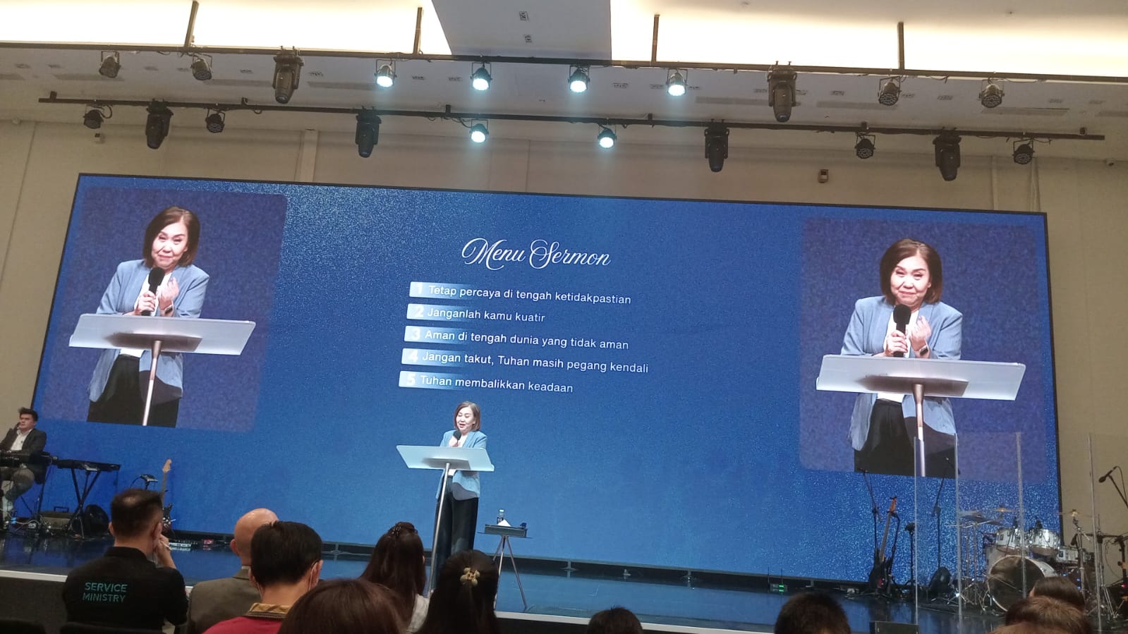 Pdm Yenny Verodika dari GMS Surabaya melayani di GMS Puri. Sebelum awali kotbah, ia minta jemaat ucapkan nubuat ke samping kanan kiri, ”Ini tahun kemenangan buat engkau.”